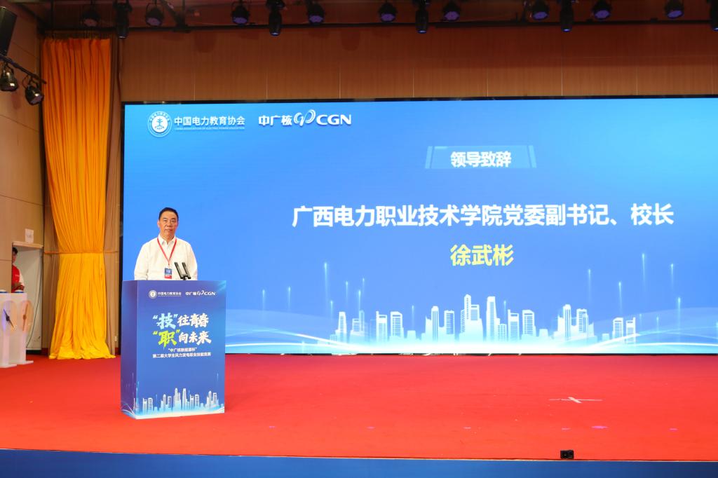 徐武彬向出席开幕式的领导、参赛选手、带队教师、裁判员致以热烈欢迎。他表示,作为国家优质专科高职院校和广西高水平高职学校,学校始终深耕电力行业,围绕国家“双碳”目标及新时代壮美广西建设需求,坚持“植根电力、立足广西、面向全国、辐射东盟”的办学定位,系统打造多个“电亮+”职教品牌,赢得广泛社会认可。他指出,本次竞赛是深化校企协同育人的生动实践,既是对全国高校风电领域人才培养成效的集中检阅,也是贯通“教学-实践-就业”生态链,为风电产业蓄能未来人才的重要纽带。希望选手以技为舟、以韧为楫,赛出新时代风电青年的精神风貌;裁判与工作人员以公为尺、以精为度,守护赛事的权威与温度;各参与院校与企业以赛为媒、聚势赋能,共筑产教融合新高地。